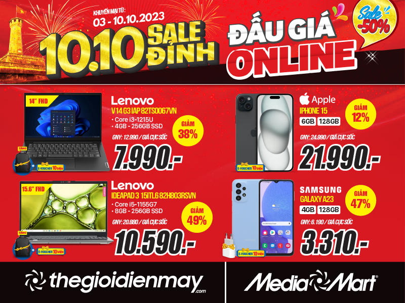Tham gia sự kiện "10.10 Sale đỉnh" tại MediaMart và sẵn sàng tận hưởng những ưu đãi hấp dẫn đến từ các thương hiệu công nghệ hàng đầu thế giới: Apple iPhone 15 128GB đã có mặt tại MediaMart với giá chỉ 21,99 triệu đồng; Samsung Galaxy A23 A235F giảm 47%, chỉ 3,31 triệu đồng.