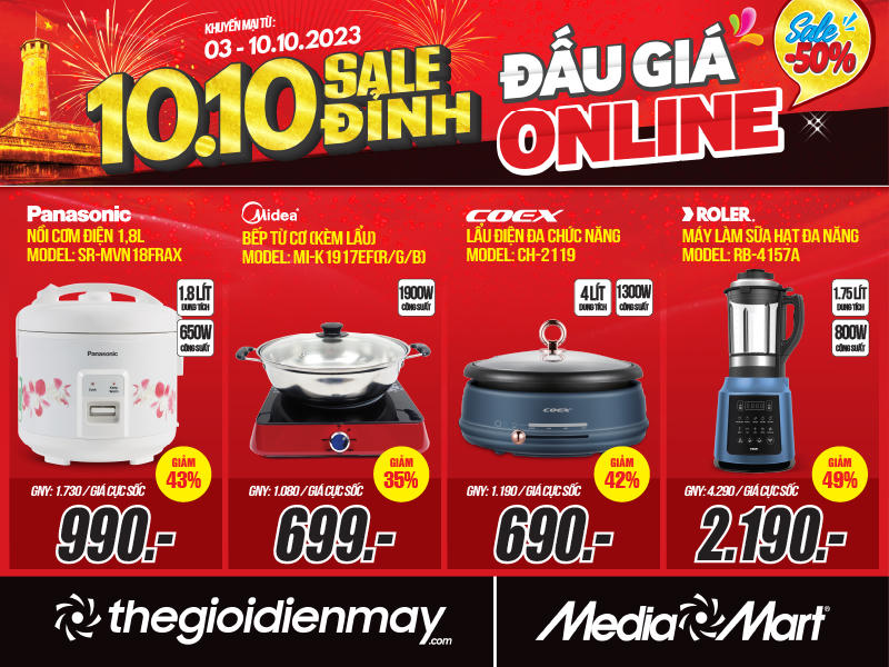 Đừng bỏ lỡ lễ hội giảm giá đồ điện gia dụng trong sự kiện “10.10 sale đỉnh” từ 3.10 đến 10.10. Chưa bao giờ mức giá tốt hơn thế: Nồi cơm điện cơ 1,8 lít Panasonic SR-MVN18FRAX giảm mạnh 43% còn 990,000 đồng; bếp từ cơ Midea MI-K1917EF tặng kèm nồi lẩu chỉ còn 699,000 đồng; lẩu điện đa chức năng Coex CH -2119 giá sốc 690,000 đồng; hay như máy xay nấu và làm sữa hạt đa năng Roler RB-4157A kèm vỉ hấp và lưới lọc cũng được giảm nửa giá, từ 4,19 triệu đồng xuống còn 2,19 triệu đồng.