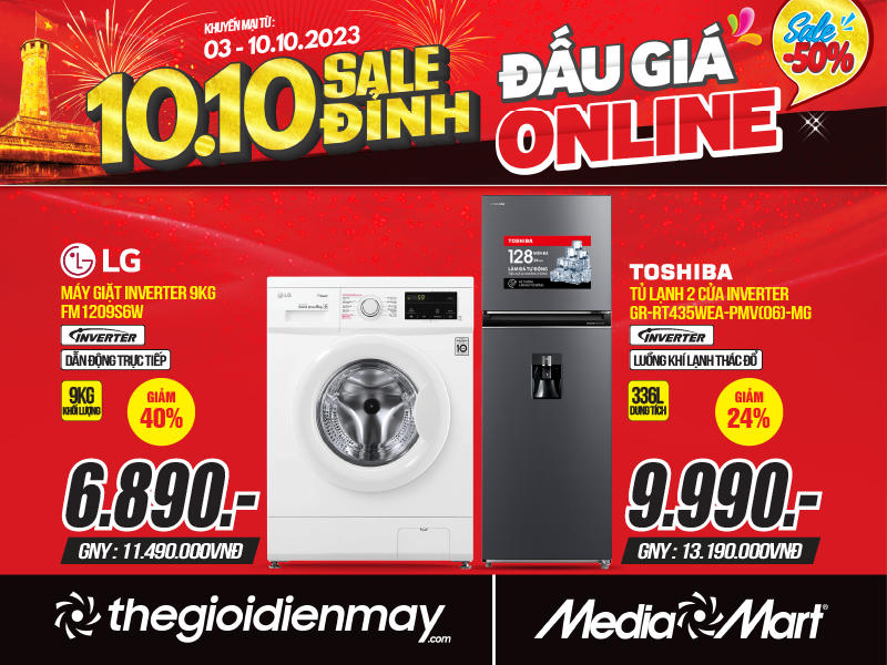 Sale đỉnh không kém phải kể đến các sản phẩm máy giặt, tủ lạnh hàng hiệu với mức giảm giá lên đến hàng chục triệu đồng: Máy giặt lồng ngang LG Inverter 9Kg FM1209S6W giá quá rẻ 6,89 triệu đồng; tủ lạnh Toshiba Inverter 336 lít GR-RT435WEA-PMV(06)-MG sale còn 9,99 triệu đồng; máy giặt lồng đứng Coex 9,5kg TW-90CW1407IGB giảm 36% còn 4,49 triệu đồng; máy sấy quần áo bơm nhiệt Heatpump Inverter Coex 10.5kg CD-10HPB giảm ngay 9 triệu đồng, giá siêu sale 10.10 chỉ còn 9,99 triệu đồng.