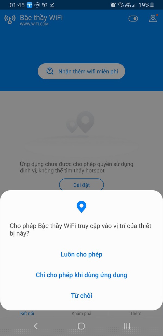 WiFi Master cần phải xác định vị trí của người dùng để có thể quét và tìm kiếm mạng WiFi phù hợp, nên trong lần đầu tiên khi kích hoạt ứng dụng, WiFi Master sẽ xin cấp quyền xác định vị trí của thiết bị. Bạn có thể chọn "Chỉ cho phép khi dùng ứng dụng" từ hộp thoại hiện ra.