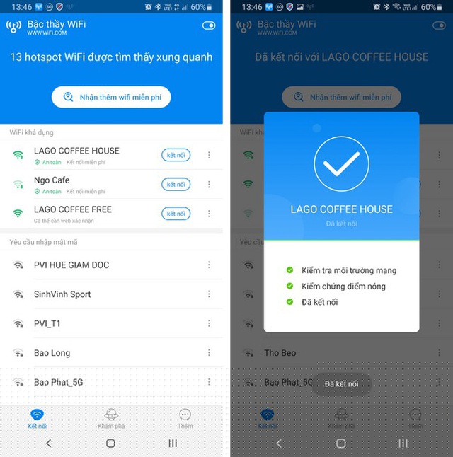 Bạn có thể chọn một mạng WiFi với mức tín hiệu tốt nhất có trong danh sách "WiFi khả dụng" để kết nối. Sau khi chọn, ứng dụng WiFi Master sẽ tiến hành kiểm tra mức độ tín hiệu và tự động kết nối smartphone vào mạng WiFi mà không cần yêu cầu phải điền mật khẩu của mạng.