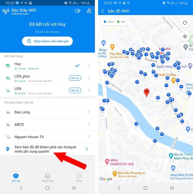 Để sử dụng tính năng này, bạn nhấn vào tùy chọn "Xem bản đồ để khám phá các hotspot miễn phí xung quanh" trên WiFi Master, lập tức, một giao diện bản đồ hiện ra sẽ hiển thị các mạng WiFi mà bạn có thể kết nối được bằng WiFi Master ở khu vực xung quanh, để bạn có thể di chuyển đến đó và kết nối mạng WiFi.