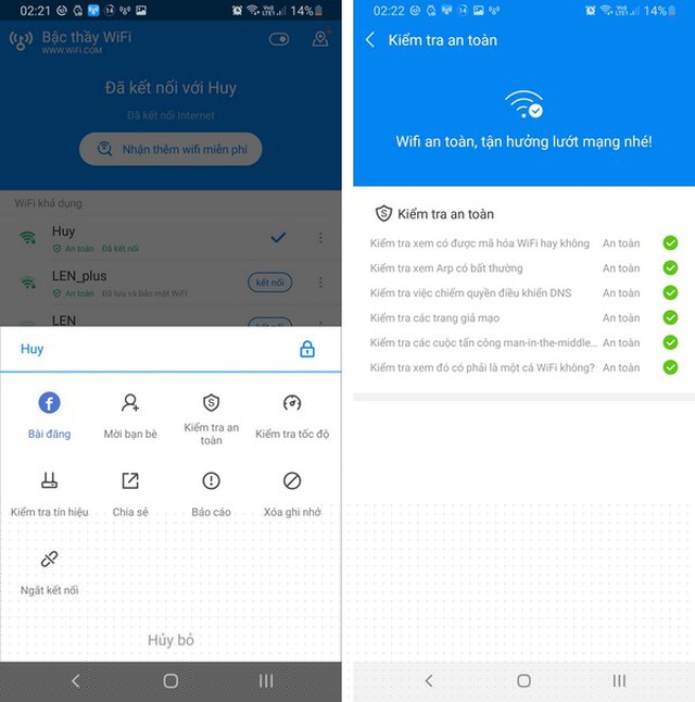 Để sử dụng tính năng này, từ giao diện WiFi Master, bạn nhấn vào mạng WiFi đang kết nối, chọn "Kiểm tra an toàn" từ menu hiện ra. WiFi Master sẽ bắt đầu quá trình quét và kiểm tra các thông tin về mạng WiFi mà bạn đang sử dụng, bao gồm đánh giá độ mạnh của mật khẩu, kiểm tra router đã được bảo vệ hay không... từ đó đưa ra kết quả cuối cùng.