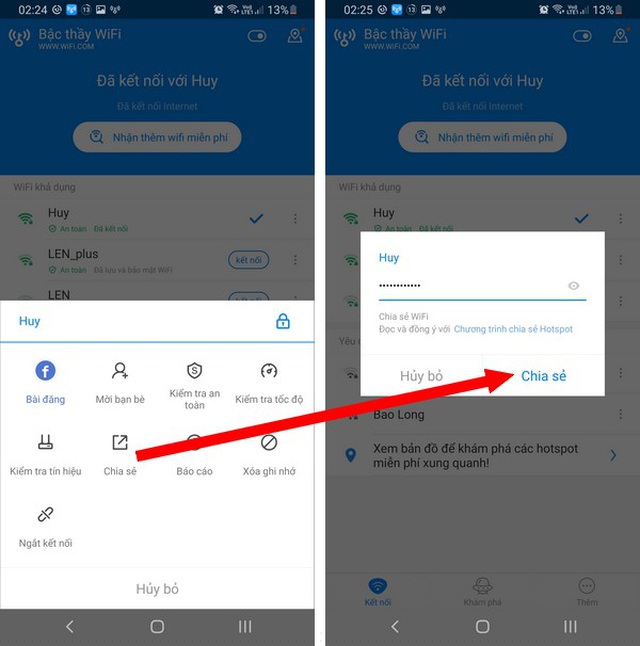 Đầu tiên, bạn kết nối vào mạng WiFi theo cách thông thường. Sau đó, kích hoạt ứng dụng WiFi Master, nhấn vào mạng WiFi mà mình muốn chia sẻ thông tin, chọn "Chia sẻ" từ menu hiện ra. Bước tiếp theo, bạn điền mật khẩu của mạng WiFi này và nhấn nút "Chia sẻ".
