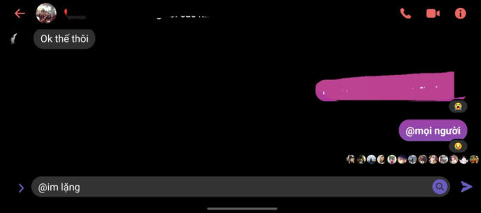 Ngược lại, người dùng Messenger hiện tại cũng chỉ sử dụng cụm từ khóa "@mọi người" để nhắc đến tất cả mọi người đang có mặt trong nhóm chat. Điều này sẽ cho phép gửi đi các tin nhắn với nội dung quan trọng và nhắc nhở mọi người trong nhóm chat được biết.