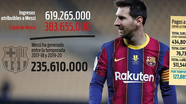 Trong khi đó, theo tờ Diario Sport, ông Marc Ciria, nhà điều hành của công ty Diagonal Inversiones (đối tác của Barcelona) và nhà tài chính Josep Fabra đã tính toán được số tiền mà Messi mang về cho Barcelona trong 3 năm qua. Con số ấy vào khoảng 619,2 triệu euro, cao hơn rất nhiều so với số tiền Barcelona trả cho cầu thủ này.