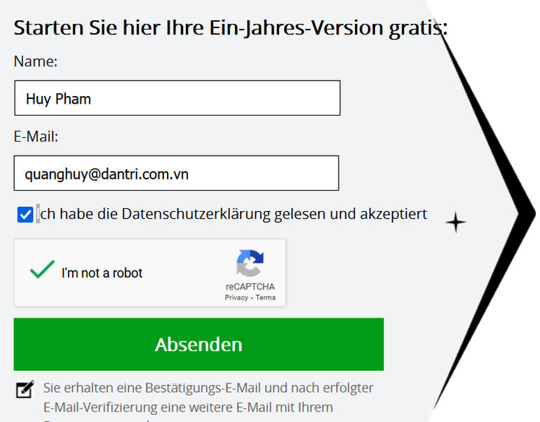 Tiếp theo, truy cập vào trang web của chương trình khuyến mãi tại đây, điền họ tên, địa chỉ email, đánh dấu đồng ý các điều khoản sử dụng, đánh vào tùy chọn "I'm not a robot" rồi nhấn nút "Absenden".