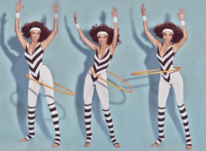 Minh Tú thoải mái tạo dáng mô phỏng lại hoạt động thể thao khi chụp cùng các dụng cụ tập luyện đơn giản. Tinh thần vui vẻ, hào hứng hiện diện rõ trên khuôn mặt của siêu mẫu.