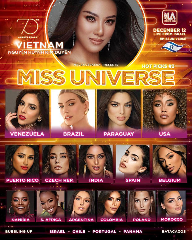 Trước đó, người hâm mộ cũng vui mừng chia sẻ khi chuyên trang sắc đẹp nổi tiếng của Venezuela công bố bảng dự đoán thứ hạng của cuộc thi, trong đó Kim Duyên được đánh giá sẽ đăng quang ngôi vị hoa hậu. Tại một số chuyên trang sắc đẹp uy tín khác như Missosology, thứ tự của Kim Duyên cũng được xếp khá cao.