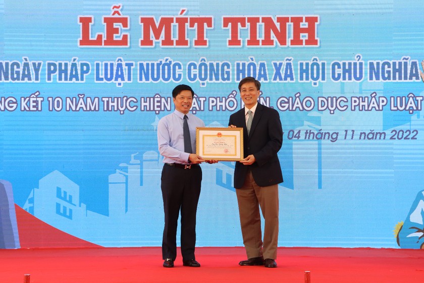 Tới dự buổi lễ có ông Nguyễn Khánh Ngọc, Thứ trưởng Bộ Tư pháp; bà Nguyễn Hương Giang – Phó Bí thư Tỉnh uỷ, Chủ tịch UBND tỉnh; ông Đào Quảng Khải – Uỷ viên BTV Tỉnh uỷ, Phó Chủ tịch UBND tỉnh, Chủ tịch Hội đồng phối hợp PBGDPL tỉnh cùng đại diện lãnh đạo các vụ, cục thuộc Bộ Tư pháp, các ban, ngành địa phương.