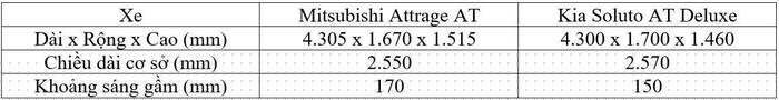 Xét về kích thước tổng thể, có thể thấy Mitsubishi Attrage 2020 nhỉnh hơn đôi chút so với Soluto về thông số kích thước chiều dài, rộng, cao và khoảng sáng gầm xe. Tuy nhiên, mức chênh lệch là không đáng kể. Với kích thước này, cả hai mẫu xe cùng đảm bảo không gian nội thất ở mức chấp nhận được đối với một mẫu xe hạng B.