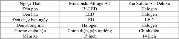 Có thể thấy, Attrage 2020 vượt hẳn đối thủ về trang bị khi gần như toàn bộ hệ thống đèn chiếu sáng sử dụng công nghệ LED, không chỉ hiện đại mà còn an toàn hơn. Gương chiếu hậu của Attrage chỉnh điện và có khả năng gập tự động. Trong khi đó, đèn pha, đèn hậu và đèn sương mù của Kia Soluto chỉ là Halogen. Kích thước mâm xe của Attrage cũng lớn hơn, tạo dáng vẻ bề thế, cứng cáp hơn so với đối thủ.