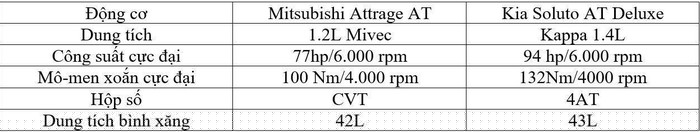 Kia Soluto mạnh mẽ hơn với động cơ xăng Kappa, hút khí tự nhiên, dung tích 1.4L sản sinh công suất tối đa 94 mã lực tại 6.000 vòng/phút và mô-men xoắn cực đại 132 Nm tại 4.000 vòng/phút, đi kèm hộp số tự động 4 cấp cho bản AT Deluxe. Việc được trang bị loại động cơ có dung tích 1.4L trên Soluto giúp cho xe có công suất và mô-men xoắn vượt trội hơn hẳn so với Attrage.