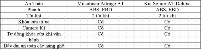 Về trang bị an toàn, Mitsubishi Attrage CVT 2020 và Kia Soluto AT Deluxe gần như tương đồng với nhau khi đều sở hữu những tính năng cấn thiếu đảm bảo an toàn chủ động và thụ động.