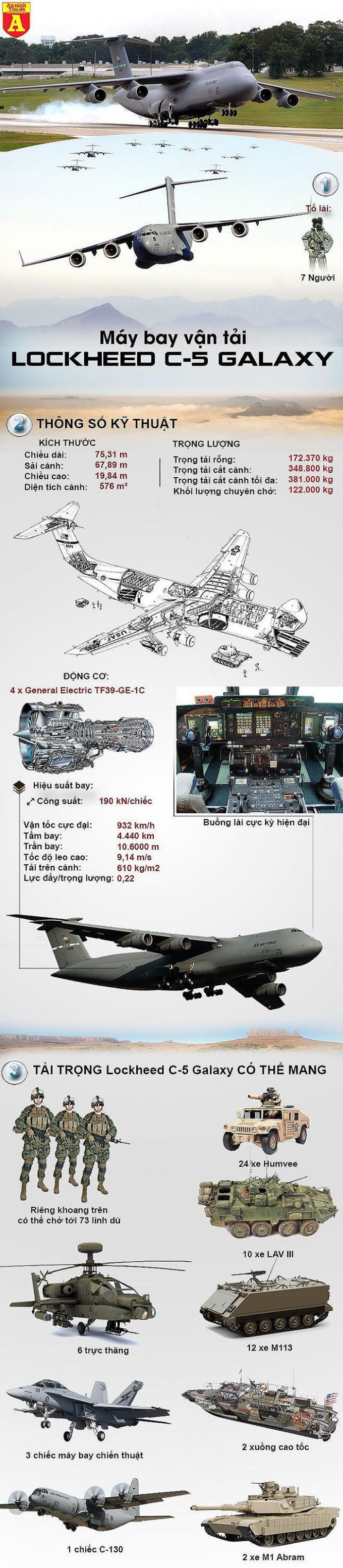 C-5 Galaxy là loại máy bay vận tải quân sự lớn nhất của Mỹ, giữ vai trò xương sống trong các nhiệm vụ vận tải chiến lược của quân đội nước này. Loại máy bay này có thể dễ dàng nhét gọn thân một chiếc máy bay vận tải tầm trung C-130 để vận chuyển đi hàng ngàn kilomet.