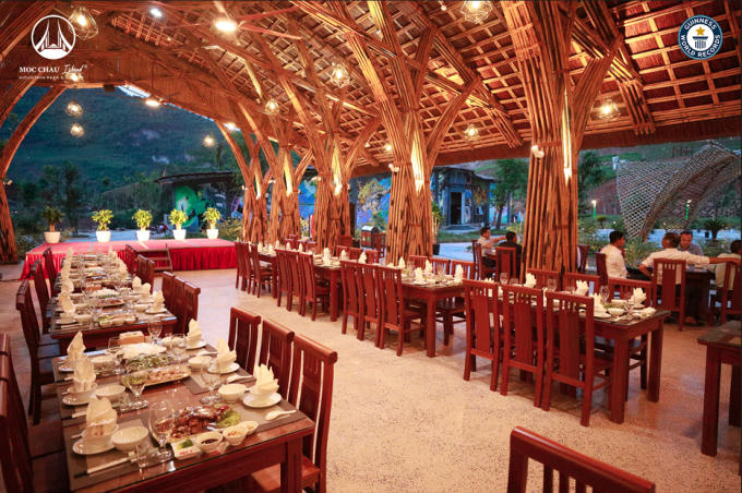 Hướng tầm nhìn từ khu nghỉ dưỡng, du khách sẽ thấy toàn cảnh với dòng sông uốn lượn cùng hình ảnh toà nhà bằng tre “khổng lồ” được thiết kế giống con Chim thần xà cánh bên dòng sông. Không gian khu nhà tre là hệ thống nhà hàng TaBamboo, được thiết kế, ghép dựng từ hơn 60.000 cây tre tầm vông được xử lý qua nhiều công đoạn kỳ công của các nghệ nhân, sau đó ghép dựng nên ngôi nhà tre có 1-2 nơi núi rừng Tây Bắc với diện tích khoảng 2.950 m2 phục vụ được khoảng 2.000 khách cùng lúc, với đa dạng các món Âu, Á và đặc sản Tây Bắc. Công trình này đã được chủ đầu tư nộp hồ sơ xác nhận, xét duyệt kỷ lục Nhà tre lớn nhất thế giới.