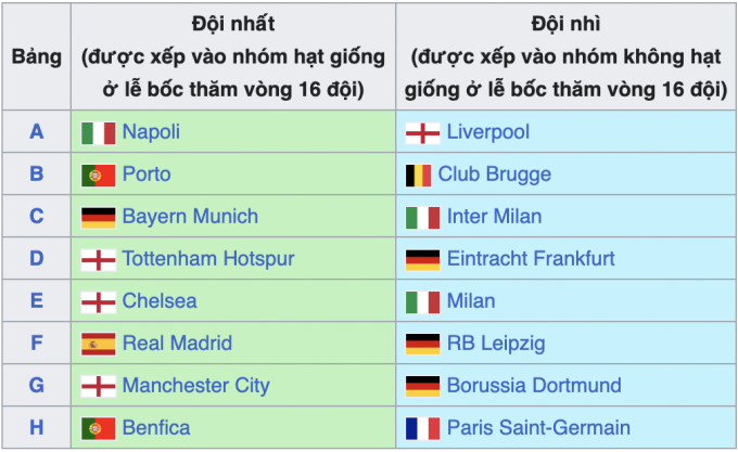 Do đứng nhì bảng, PSG có nguy cơ đụng một trong bảy đội gồm Napoli, Porto, Bayern, Tottenham, Chelsea, Real và Man City. Một đội bóng lớn khác không được xếp hạt giống ở vòng 1/8 là Liverpool, và họ sẽ gặp Porto, Bayern, Real hoặc Benfica.