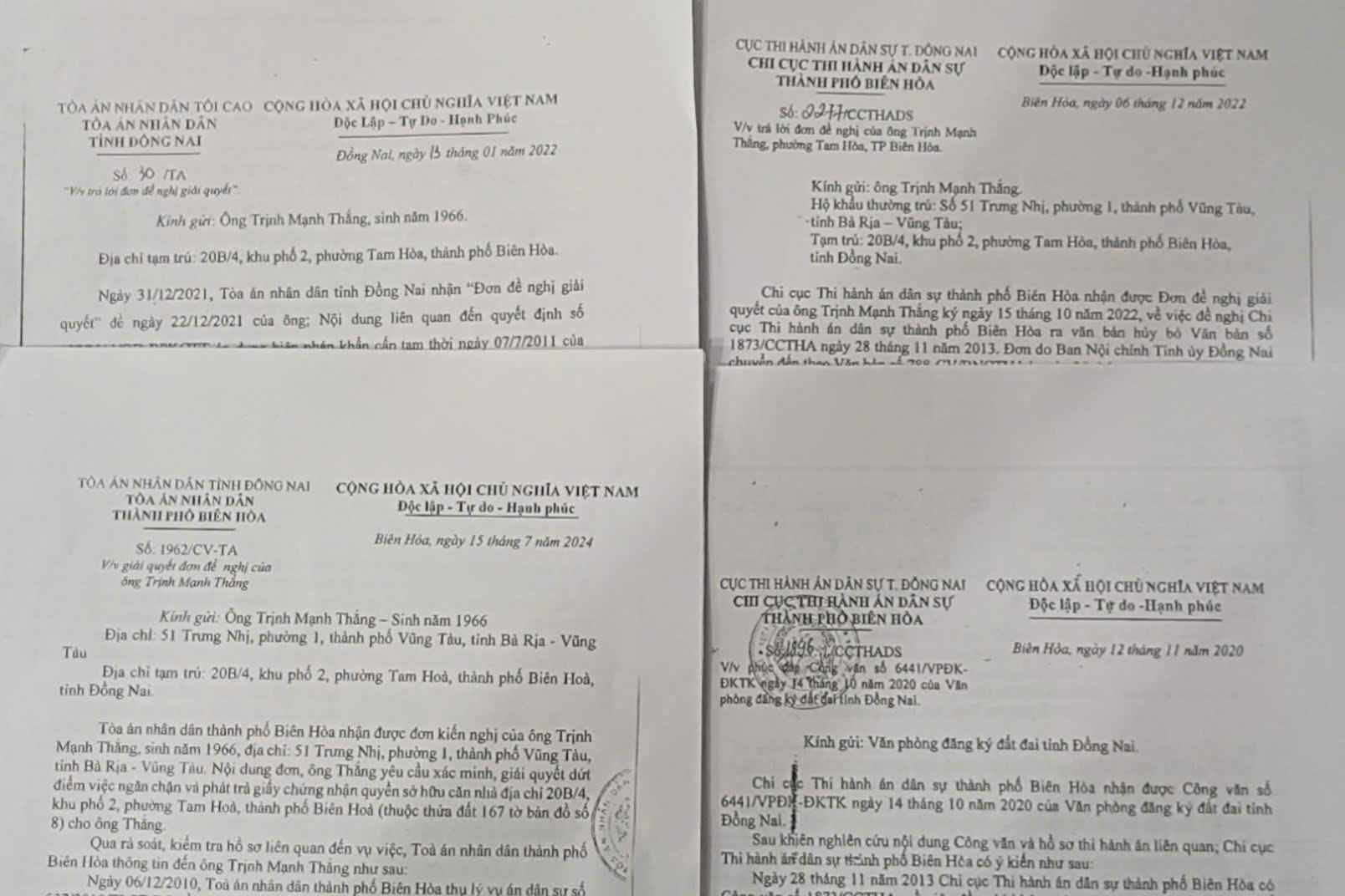 Nhận thấy quyền lợi của mình có dấu hiệu bị xâm phạm, nhiều năm qua, ông Thắng đã gửi đơn khiếu nại nhiều nơi: từ UBND TP Biên Hòa (cũ), Văn phòng đăng ký đến Tòa án các cấp và Chi cục Thi hành án dân sự TP Biên Hòa (nay là Phòng Thi hành án dân sự Khu vực 1 - Đồng Nai). Trong nội dung của đơn từ, ông Thắng luôn yêu cầu phải hủy bỏ quyết định áp dụng biện pháp khẩn cấp tạm thời với căn nhà.
