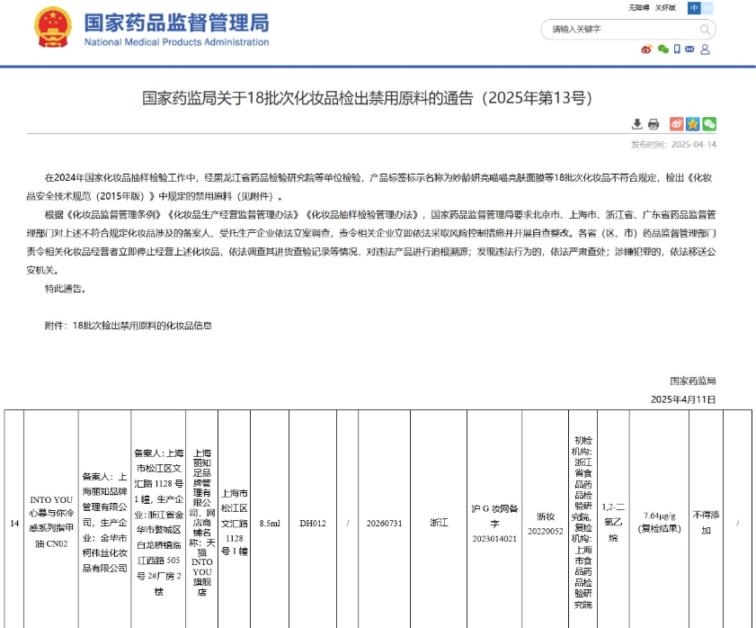 Ngày 14/4, Cục Quản lý Dược phẩm Quốc gia Trung Quốc đã công bố danh sách 18 lô mỹ phẩm chứa nguyên liệu bị cấm theo Thông báo số 13 năm 2025.