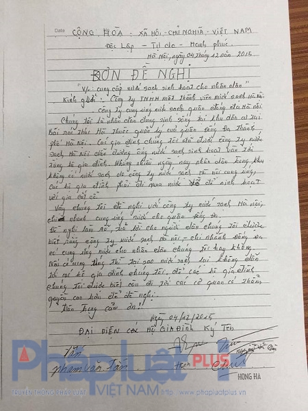 | Đơn đề nghị của những hộ dân gửi xí nghiệp kinh doanh nước sạch Đống Đa để giải quyết tình trạng mất nước. |