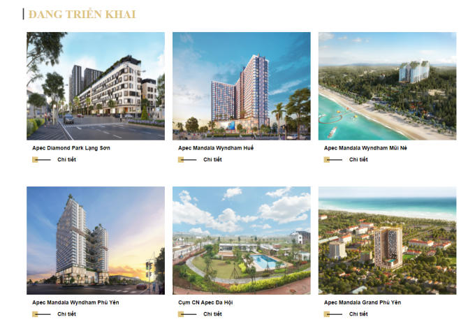 Chỉ trong thời gian ngắn, nhà phát triển địa ốc này đã tung ra bộ sưu tập khủng các dự án nghỉ dưỡng trải dài từ Bắc đến Nam như APEC Mandala Wyndham Mũi Né, APEC Diamond Park Lạng Sơn, APEC Golden Palace Lạng Sơn, APEC Mandala Wyndham Huế, APEC Mandala Wyndham Phú Yên, APEC Mandala Wyndham Hải Dương, APEC Mandala Sky Villas Kim Bôi, APEC Aqua Park Bắc Giang, APEC Golden Valley Mường Lò, APEC Aqua Park Bắc Giang, Điềm Thuỵ Center Point, Cụm công nghiệp APEC Đa Hội, APEC Dubai Ninh Thuận.… với tổng mức đầu tư lên tới hàng nghìn tỷ cho mỗi dự án.