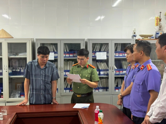 Cơ quan điều tra tống đạt các quyết định tố tụng (Ảnh: Công an Hà Nội).