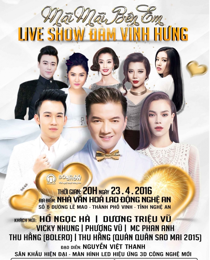 Liveshow Đàm Vĩnh Hưng – Mãi mãi bên em với sự tham gia của các khách mời Hồ Ngọc Hà, Dương Triệu Vũ, Vicky Nhung, Phượng Vũ, Thu Hằng (quán quân Solo cùng Bolero), Thu Hằng (Giải nhất dòng nhạc dân gian Sao Mai 2015), sẽ diễn ra vào lúc 20h ngày 23/4/2016 tại Nhà Văn hóa Lao Động thành phố Vinh –Số 6 đường Lê Mao – Thành phố Vinh – Nghệ An.