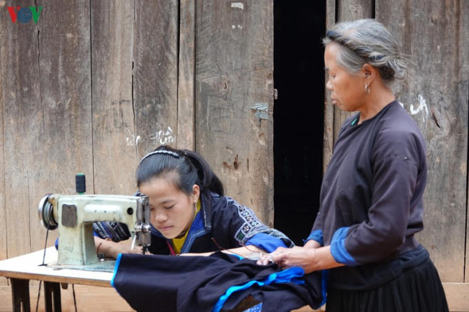 Bà dạy cháu thêu những hoa văn truyền thống.
