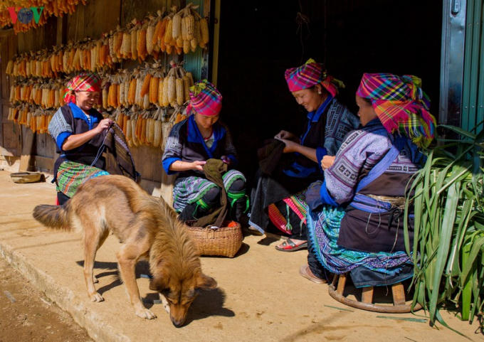 Phụ nữ Mông tập trung làm việc và trò chuyện vô cùng thảnh thơi sau một vụ cấy trồng.