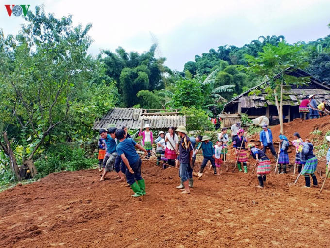 Người dân cùng nhau sửa chữa nhà cửa thôn bản.