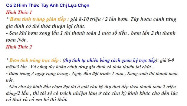 Chúng tôi tìm cách liên lạc với một thanh niên có email: [email protected], anh này không ngần ngại ra giá: “Chị gặp em cũng được, không gặp cũng không sao. Chị cứ cho địa chỉ phòng khám, em sẽ tới làm xét nghiệm. Nếu các chỉ số đều OK thì có thể trữ được. Trữ xong mẫu thứ ba phiền chị thanh toán cho em trước hai triệu đồng. Sau đó, đúng ngày giờ em sẽ tới bệnh viện chị yêu cầu để làm. Khi xong xuôi, chị vui lòng thanh toán cho em nốt 15 triệu. Nếu chị bơm hai lần, em sẽ lấy hai lần 30 triệu thôi”.