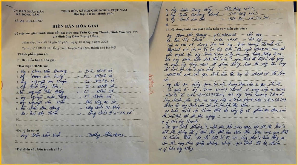 Trước kiến nghị của gia đình ông Thanh, Ủy ban nhân dân xã Đồng Tâm đã tiến hành cuộc hòa giải về việc tranh chấp đất đai giữa gia đình ông Trần Quang Thanh, ông Đinh Văn Sức với gia đình ông Đàm Trọng Hồng.