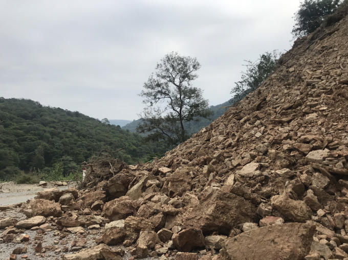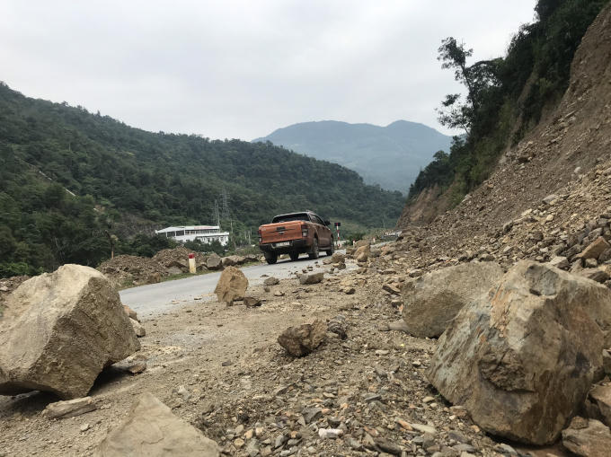 Những khối đá lớn đổ xuống mặt đường vô cùng nguy hiểm.