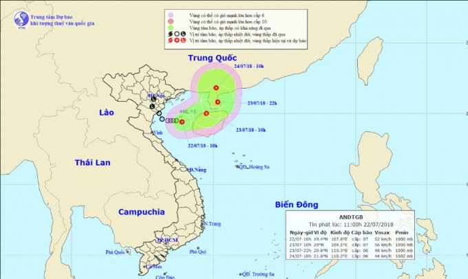 | Tin áp thấp nhiệt đới gần bờ Trong khi mưa lớn diện rộng đang diễn ra ở Bắc Bộ, Bắc Trung Bộ, nhiều khu vực có nguy cơ lũ quét, sạt lở đất, Trung tâm Dự báo Khí tượng Thủy văn Quốc gia vừa phát đi thông tin về một áp thấp nhiệt đới (ATNĐ) xuất hiện trên Biển Đông, đồng thời cảnh báo khả năng xuất hiện thêm một áp thấp nhiệt đới khác tại Vịnh Bắc Bộ. Đối với ATNĐ trên biển Đông, đến 10 giờ ngày 23.7, vị trí tâm ATNĐ ở khoảng 20,0 độ Vĩ Bắc; 109,5 độ Kinh Đông, trên khu vực phía Tây Bắc đảo Hải Nam. Sức gió mạnh nhất vùng gần tâm ATNĐ mạnh cấp 6-7 (40-60km/giờ), giật cấp 8. Phạm vi gió mạnh cấp 6, giật cấp 8 khoảng 60km tính từ tâm áp thấp nhiệt đới. Do ảnh hưởng của hoàn lưu ATNĐ, trên đất liền ven biển các tỉnh từ Quảng Ninh đến Nghệ An có gió giật cấp 6-7; ở vịnh Bắc Bộ (bao gồm cả huyện đảo Bạch Long Vĩ và Cô Tô) có gió mạnh cấp 6-7, giật cấp 8 và có mưa dông mạnh. Biển động mạnh. Cấp độ rủi ro thiên tai: Cấp 3. |