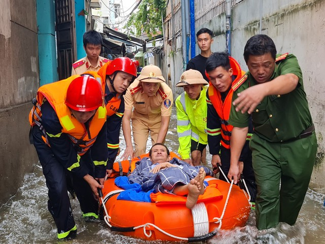 Cảnh sát PCCC&CNCH, CSGT Công an TP Đà Nẵng đưa một người dân mắc kẹt trong lũ đi cấp cứu (Ảnh: VGP/Nhật Anh)