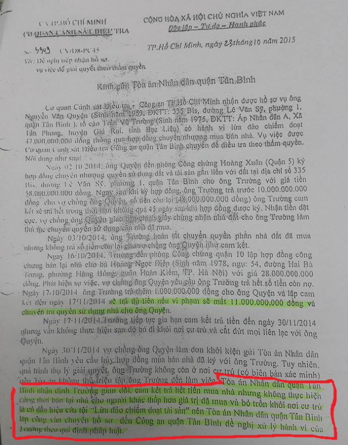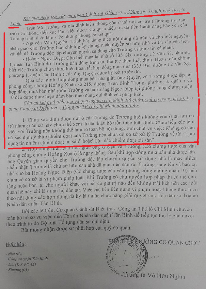 Vụ việc có dấu hiệu lừa đảo này đã được TAND quận Tân Bình thụ lý, nhưng nhận thấy vụ việc có dấu hiệu hình sự nên đã chuyển đến cơ quan công an các cấp để điều tra.