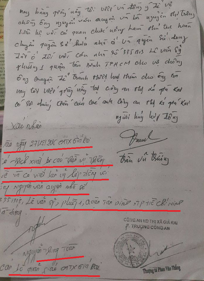 Ngày 27/12/2016, ông Quyện đã vào trại và gặp Trường để viết “Biên bản hủy hợp đồng”. Nội dung biên bản có đoạn Trần Vũ Trường cam kết: “Trước đây, tôi là người mua căn nhà 335 Bis Lê Văn Sỹ, phường 1, Tân Bình, TP HCM. Tôi có cam kết trả nợ đủ số tiền 58 tỷ cho ông Quyện trong vòng 45 ngày. Hiện tôi đang chấp hành án tù tại trại giam Bến Giá, Trà Vinh, nên không đủ khả năng thực hiện cam kết nêu trên. Nay bằng giấy này tôi viết và đồng ý để vợ chồng ông Nguyễn Văn Quyện và bà Nguyễn Thị Trông liên hệ với cơ quan chức năng làm thủ tục hoàn chuyển sở hữu nhà ở và quyền sử dụng đất ở đối với căn nhà số 335 bis Lê Văn Sỹ, phường 1, quận Tân Bình”.