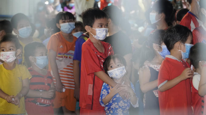 Các em nhỏ tại khu điều trị bệnh nhân covid-19 Thới Hòa xếp hàng ngay ngắn, háo hức chờ đón những phần quà Trung thu.