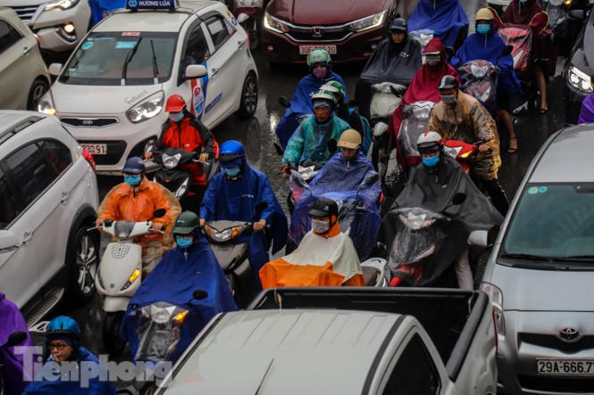Do ảnh hưởng của bão số 13 gây mưa trên diện rộng khiến đường phố trở nên đông nghẹt người ngay trong sáng đầu tuần đi làm.