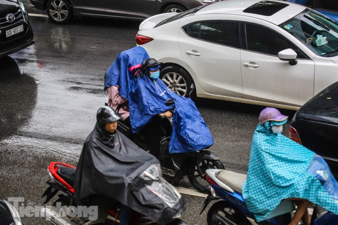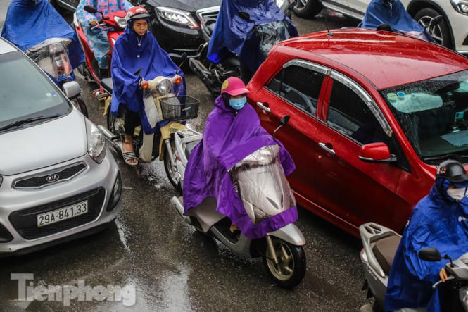 Hầu hết người tham gia giao thông đều "ẩn mình" dưới áo mưa.