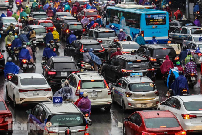Dưới trời mưa, các phương tiện di chuyển càng khó khăn.