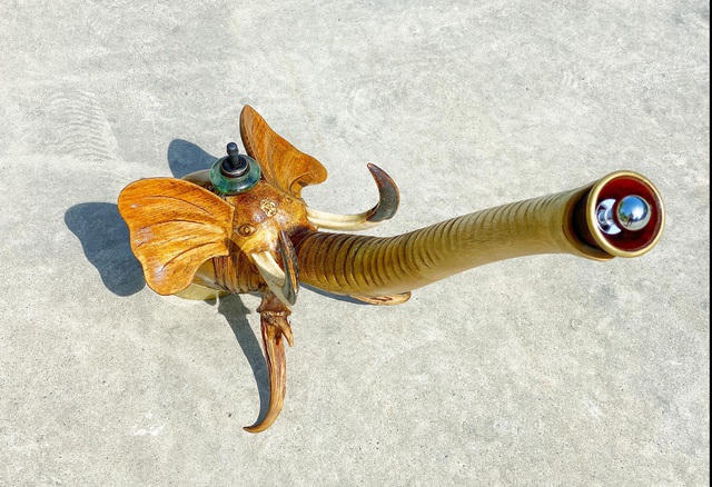 Để tô điểm, trang trí cho vật phẩm thêm hoàn hảo, anh Tuấn mới nghĩ đến việc dát vàng một số chi tiết. Cụ thể, anh đã tạo hình con rồng uốn lượn trên thân điếu cày bằng vàng 4 số 9, ở miệng có ngậm ngọc ruby.