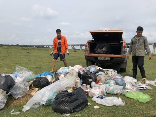 Người dân tham gia thu gom rác thải ở khu vực bãi giữa, phường Long Biên