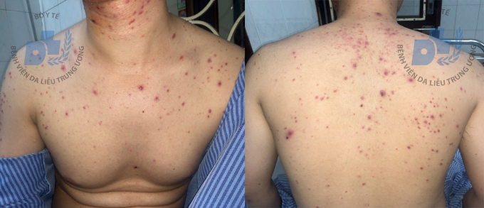 Các bác sĩ tại Bệnh viện Da liễu Trung ương cho biết, bệnh nhân đến cầu cứu các bác sĩ Bệnh viện Da Liễu Trưng Ương trong tình trạng sẩn, mụn mủ nghiêm trọng vùng mặt, thân mình, không chỉ ảnh hưởng tới thẩm mĩ và còn gây cẩm giác ngứa, nóng rát khó chịu.