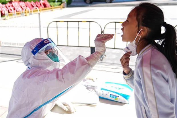 Nhân viên y tế lấy mẫu xét nghiệm COVID-19 cho người dân tại Bắc Kinh, Trung Quốc, ngày 30/4/2022. (Ảnh: THX/TTXVN)