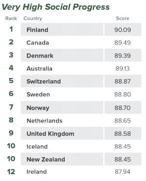 Đứng đầu trong bảng xếp hạng năm nay về Chỉ số tiến bộ xã hội là Phần Lan. Theo sau đó các nước Canada, Đan Mạch, Australia và Thụy Sĩ.