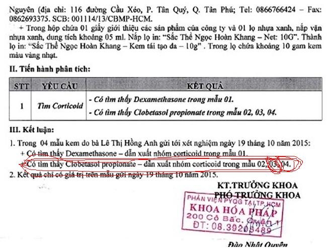 | Link: http://baohatinh.vn/xa-hoi/xu-phat-co-so-kinh-doanh-my-pham-chua-cong-bo-chat-luong/100023.htm) Ngày 13/8/2015, Đoàn kiểm tra liên ngành Phòng chống buôn lậu, Gian lận thương mại, sản xuất kinh doanh hàng giả Hà Tĩnh đã kiểm tra đột xuất tại cơ sở kinh doanh mỹ phẩm thuộc hộ kinh doanh Nguyễn Thị Nga (tại xóm Thanh Phú, xã Thạch Trung, TP Hà Tĩnh, Hà Tĩnh) qua đó phát hiện một lượng mỹ phẩm nhau thai cừu phấn hoa chưa được chứng nhận công bố chất lượng sản phẩm. Đoàn đã tiến hành lập biên bản xử phạt hành chính 5 triệu đồng và buộc cơ sở tự tiêu hủy toàn bộ số mỹ phẩm nói trên. Ngoài ra, vào ngày 21/10/2015, Phân viện Pháp y Quốc gia TP HCM đã tiến hành phân tích mẫu sản phẩm Kem Cream Q-10 Sắc Ngọc Trai Khang sản xuất từ thảo dược thiên nhiên của Công ty TNHH SXTM Mỹ phẩm Lê Hoàng Hà My. Kết quả cho thấy, có chất Clobetasol Propionate độc hại trong sản phẩm này (http://vfpress.vn/kinh-doanh/hiem-hoa-tu-my-pham-chua-corticoid-141167.html |