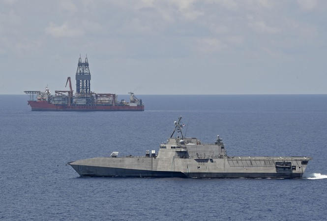 Tàu chiến Mỹ đi gần tàu thăm dò dầu khí West Capella do Malaysia thuê, hoạt động ở Biển Đông. Ảnh: Korea Herald
