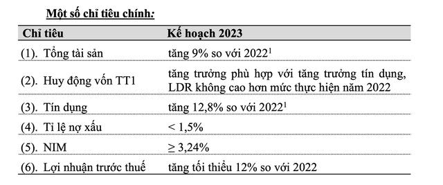 Năm 2023, Vietcombank đặt mục tiêu tổng tài sản tăng 9% so với năm 2022, huy động vốn trên thị trường 1 tăng trưởng phù hợp với tốc độ tăng trưởng tín dụng, tỷ lệ LDR không cao hơn mức thực hiện năm 2022, lợi nhuận tăng tối thiểu 12%, tín dụng tăng 12,8% so với năm 2022…