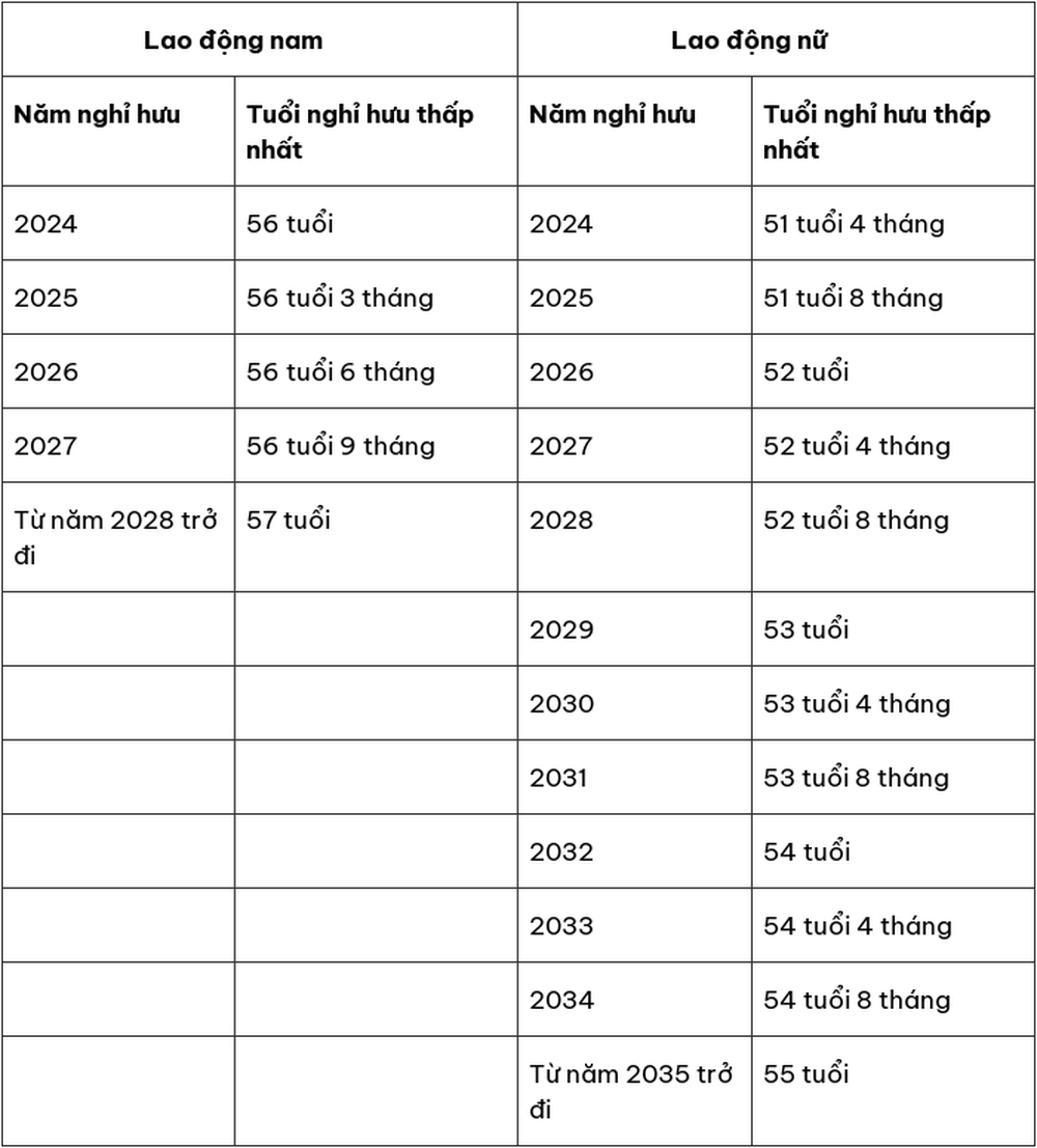 Theo đó, vào năm 2024 độ tuổi nghỉ hưu của NLĐ nam sẽ là 61 tuổi, lao động nữ sẽ là 56 tuổi 4 tháng.